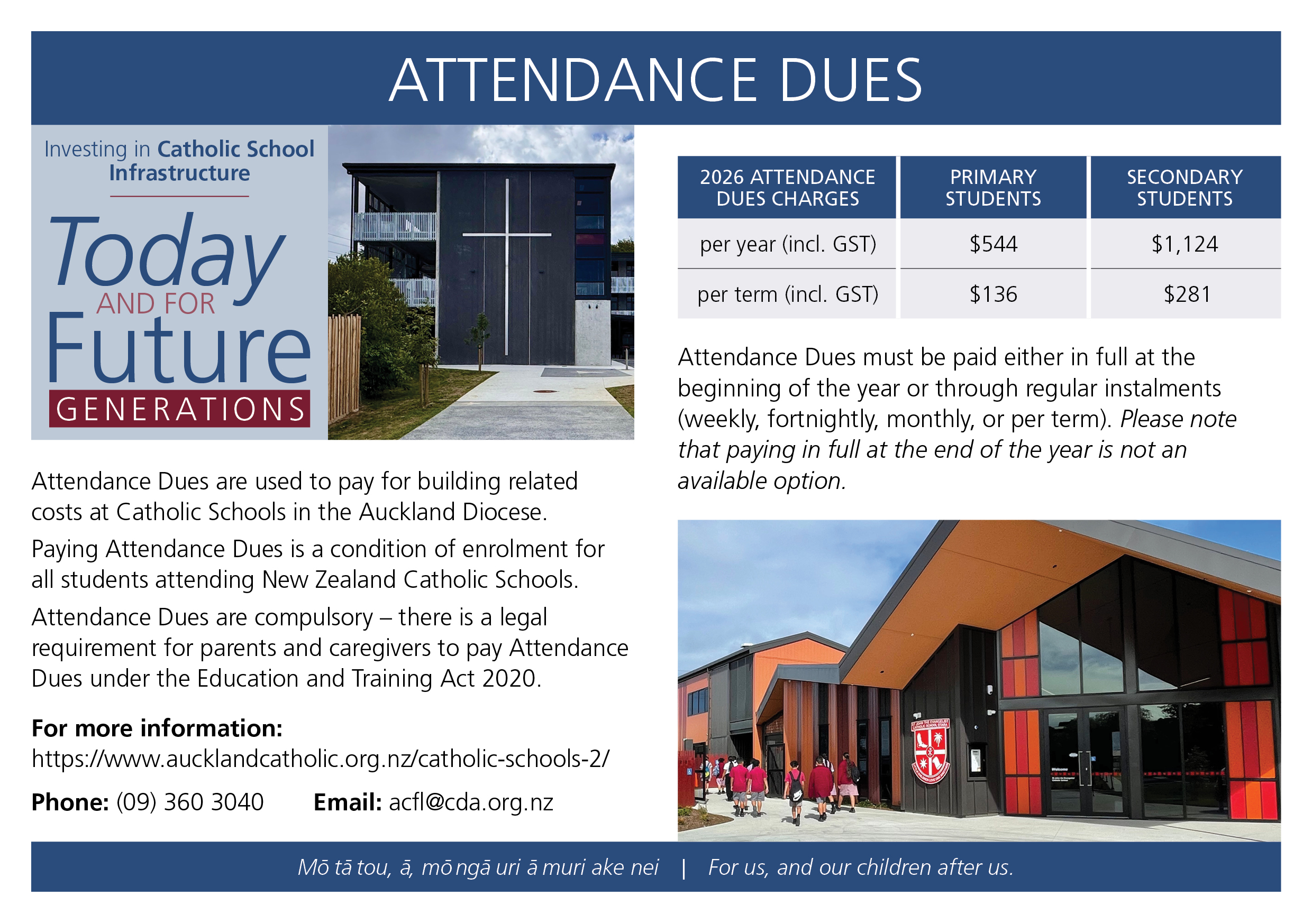 Attendance Dues are collected by Pompallier Catholic College on behalf of the school’s Proprietor, the Roman Catholic Bishop of Auckland. The Attendance Dues collected by Pompallier Catholic College are forwarded to Auckland Common Fund Limited, a company established by the Proprietors of Catholic integrated schools in the Diocese of Auckland responsible for the collection of Attendance Dues.
