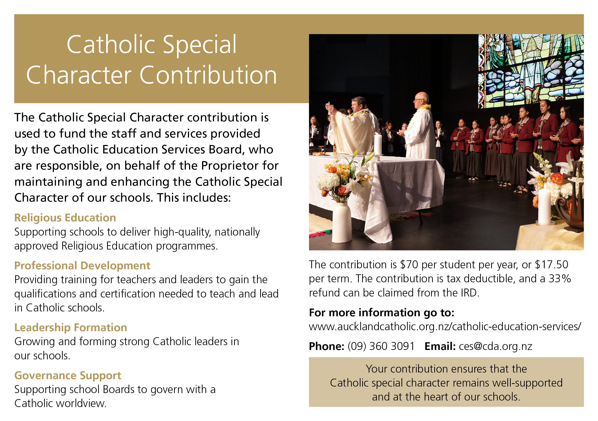 The Catholic Special Character contribution is a voluntary donation of $15.00 per term ($60.00 per annum) per student. This will increase to $17.50 per term ($70.00 per annum) in 2026.